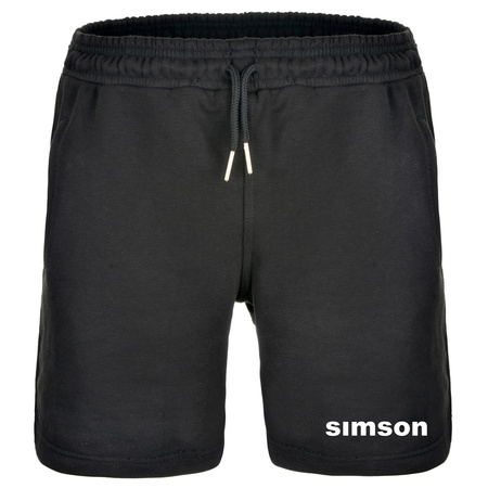Short sweat shorts in hotpants style for women in black with a white "SIMSON" logo print on the leg.