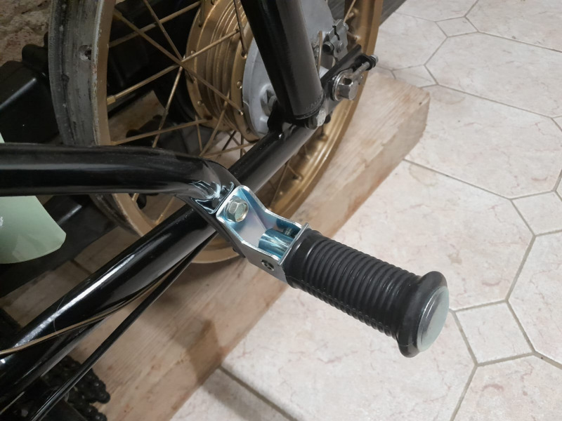 Für neulackierten Rahmen und Chromstoßdämpfer müssen neue Fußrasten dran.