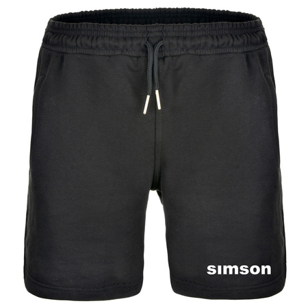 Stilvolle kurze Damen-Hotpants in klassischem Schwarz, verziert mit dem weißen "SIMSON"-Logo auf einem Bein. Diese Hotpants bieten komfortable Passform und sind ideal für Simson-Fans.