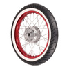 Odkryj Kompletne koło przednie 1.5x16" z anodyzowaną na czerwono aluminiową obręczą, wytrzymałymi szprychami ze stali nierdzewnej i stylową białą oponą Mitas MC2. Idealne dopasowanie do modeli Simson, takich jak KR51/1 Schwalbe, S51 i wielu innych.